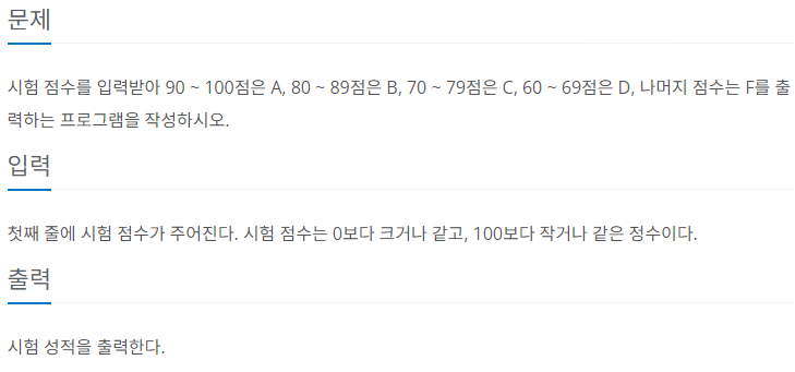 풀이score = int(input())if score >= 90: grade = 'A'elif score >= 80: grade = 'B'elif score >= 70: grade = 'C'elif score >= 60: grade = 'D'else: grade = 'F' print(grade)