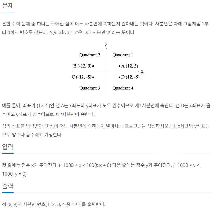 풀이x 좌표가 양수인지 음수인지 확인y 좌표가 양수인지 음수인지 확인해당하는 사분면 출력x = int(input())y = int(input())if x > 0 : if y > 0 : print(1) else: print(4)else: if y > 0: print(2) else: print(3)